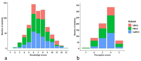 Distribution of knowledge and perception scores among students of three selected school: (a) Knowledge scores; (b) Perception scores.