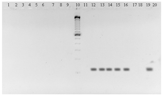 143 bp amplicons of C. perspicillata in brain, (lane 2), heart (lane 13), lung (lane 14), liver (lane 15), spleen (lane 16); YFV positive control (lane 19) and negative control (lane 20). Molecular weight marker 100 pb Invitrogen (lane 10).