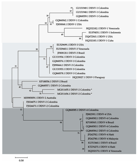 Phylogenetic tree showing 4 clades that correspond to the 4 serotypes of the DENV. Sequences MG011655 and MG011656 (marked with an asterisk) were detected in bats from Cordoba, Colombia, the sequences are in the clade, these sequences correspond to serotype 2 of DENV. DENV-2.