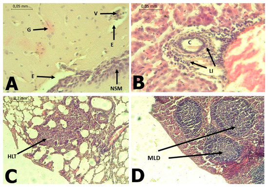 (A): Brain of C. perspicillata with the presence of gliosis (G), perineural edema (E), vasculitis (V), non-suppurative meningitis (NSM) of lymphoid type B. (H&E stain 400×). (B): Liver of C. perspicillata with lymphoid infiltrate (LI) around portal triad (C) (H&E stain 400×). (C): Lung of C. perspicillata with hyperplasia of lymphoid tissue associated with bronchi (HLT), thickening of alveolar septa, interstitial pneumonia (H&E stain 100×). (D): Spleen of C. perspicillata with moderate lymphoid depletion (MLD) in lymph node (H&E stain 100×).