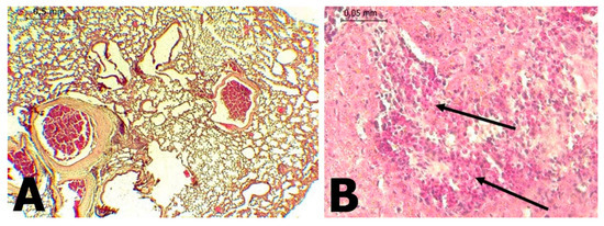(A): Lung of P. discolor with presence of congestion (H&E stain 100×). (B): Liver of P. discolor with severe eosinophilic lymphocyte mixed necrotic hepatitis and (H&E stain 400×).