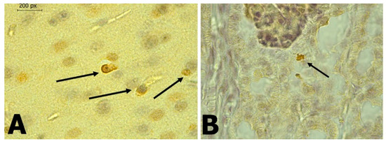 In the DENV-2, PCR-positive C. perspicillata specimen, the spleen’s lymphatic nodules presented moderate lymphoid depletion, and DENV antigens were found using IHC. The presence of viral antigens in the spleen could be a consequence of a high concentration of mononuclear cells, which allow for the replication of DENV [31,54,55].