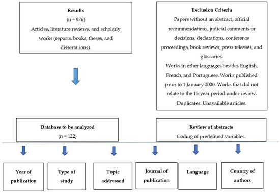The following items were included: original articles, literature reviews, and scholarly works (reports, books, theses, and dissertations). The following items were excluded through manual screening: papers without an abstract, official recommendations, judicial comments or decisions, declarations, conference proceedings, book reviews, press releases, and glossaries. Works in other languages besides English, French, and Portuguese were excluded, as were works published prior to 1 January 2000 or works that did not relate to the 15-year period under review (2000–2015).