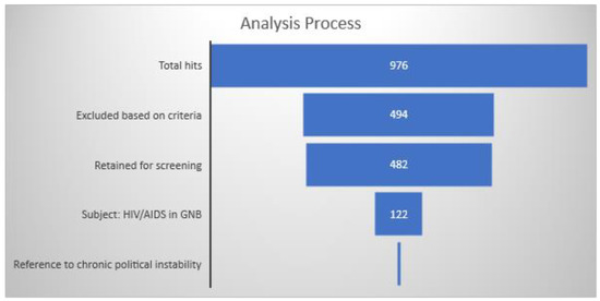 We conducted a textual analysis of the 122 articles about HIV/AIDS in Guinea-Bissau (Figure 4). The 122 retained articles were reviewed for any reference to themes related to political instability, e.g., assassinations, coup d’états, governance, and civil war or any of its variants. Six articles described factors related to political instability, and they are summarized in Table 4 The six studies were biomedical in nature and published in biomedical journals. Study populations comprised HIV or TB patient populations, pregnant women, military personnel, and police officers. There were no standard measurements used to measure the effects of political instability.