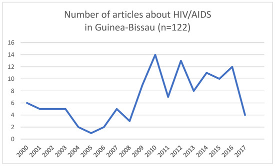 The search yielded 946 records from search engines, and an additional 30 articles from the grey literature were added. Exclusion criteria were applied, and the following records were eliminated: duplicates (270), articles published prior to the year 2000 (212), articles written in other languages (7), and articles not found (5). We screened the remaining 482 articles for eligibility and identified 122 articles about HIV/AIDS in Guinea-Bissau during the 15-year period under review. The results are summarized in Table 1, Table 2, Table 3 and Table 4. From 2010 to 2017, there was generally an increase in the number of articles published about HIV/AIDS in Guinea-Bissau compared to the period of 2000–2009. Between 4 and 14 articles were published annually from 2010 to 2017 (see Figure 4). In total, we found 36 studies based on cohort analyses (29.5%) of which 6.6% were specified as prospective analyses, 6.6% were specified as retrospective (6.6%) analyses, and the remainder unspecified (16.4%). Studies based on clinical microbiology (20.5%) were next represented, followed by cross-sectional analyses (13.1%).