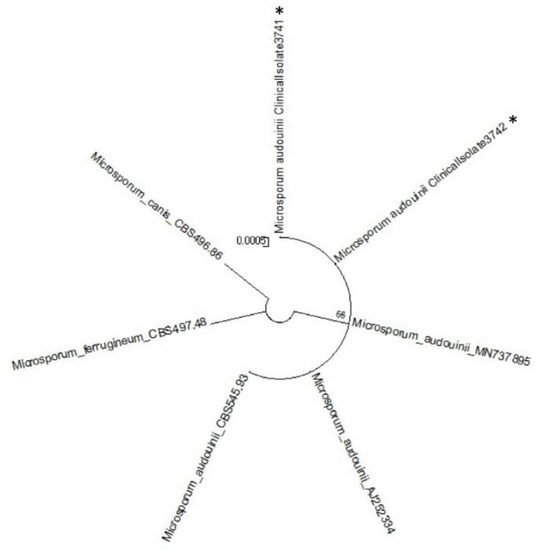 Molecular phylogenetic tree of the two strains of Microsporum audouinii from our study (shown with ⁎).