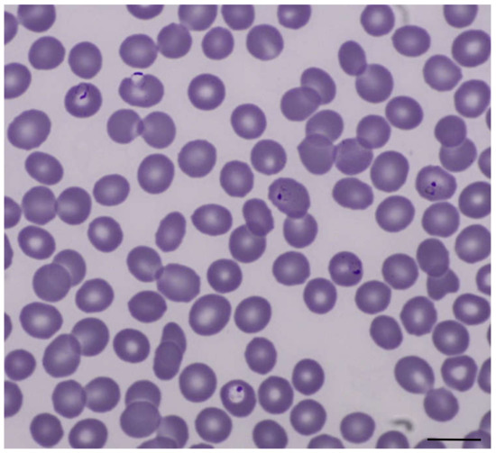 Thin blood film with Plasmodium falciparum trophozoites, Giemsa stain, original magnification 1000×. Scale bar: 10 µm