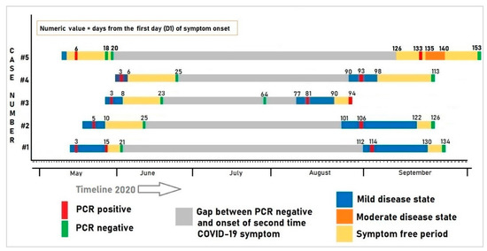 The clinical course of the patients over time (onset of symptoms, severity, duration, recovery time) and PCR results are illustrated in Figure 1. Figure 1 clearly demarcates two episodes of COVID-19 illness.