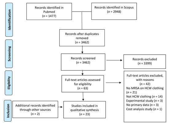 The present systematic review was conducted in accordance with the Preferred Reporting Items for Systematic Reviews and Meta-analyses (PRISMA) guidelines []. PubMed and Scopus were systematically searched for the articles published from 2000 up to 28 April 2020. The search term applied consisted of the following key words: (staphylococcus OR staphylococci OR gram-positive) AND (cloth OR clothing OR textiles OR attire OR uniform OR coat OR coats), in order to identify all the published articles reporting data on the isolation of MRSA on healthcare workers’ clothing. Reference lists of final articles were also reviewed.
