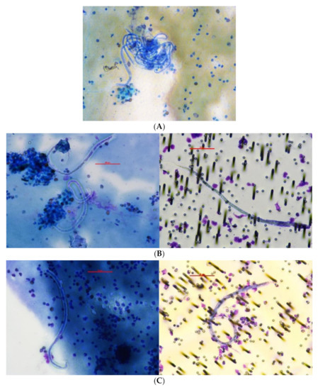 Participant ID 1: Microfilariae on slides and filter of 59 year old male in 2018 and 2019 (day 0 and 7): (A) 2018 slide from fingerprick heparin blood, 400×; (B) 2019 day 0 slide from heparin fingerprick blood and filter from venous EDTA blood, 400×; (C) 2019 day 7 slide from heparin venous blood and filter from venous EDTA blood, 400×.