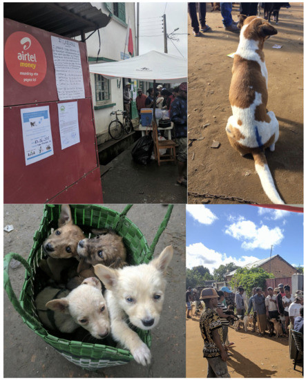 The campaign was planned as a series of static point vaccination stations covering 1–3 fokontany (i.e., sub-communes) per day (see Figure 1). A week before the campaign dates, the vaccination team informed the chief of the fokontany about the campaign and provided fliers advertising the date of the vaccine and that it would be available at no cost to owners (Figure 1). During the campaign, we used Rabisin (10 mL vials with 1 mL per dose, Boehringer Ingelheim) to vaccinate both dogs and cats presented that were at least 1 month old based on current WHO recommendations for endemic settings [4,14]. Rabisin has a manufacturer-stated duration of protection of 1 year given one dose and of an additional three years if an additional dose is given approximately one year after the first dose. As part of the campaign, owners were surveyed by vaccinators about how many dogs and cats they owned in total (split by >1 year vs. <1 year in order to avoid language ambiguities that might result in excluding puppies and kittens) as well as if their dogs were free roaming (no restrictions on movement by the owner/‘Mirenyreny’, tied/‘Mifatora’, or fenced/‘Mifefy’). Vaccinations were delivered at no cost to owners, but as animal vaccinations are generally thought of as a paid service in Madagascar, owners were asked how much in Ariary they would be willing to pay to have one animal vaccinated against rabies (after being informed that the current vaccination was free). For each animal vaccinated, we recorded the species (cat or dog), sex, approximate age in years as reported by the owner, and whether the animal had been previously vaccinated.