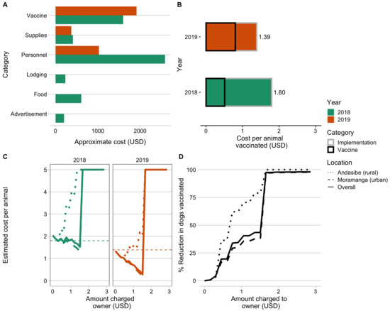 The 2018 campaign cost more overall and per animal vaccinated than the 2019 campaign, largely due to increased personnel costs (Figure 2A,B and Table 1). Reflecting the extra personnel necessary to run the static point campaign, the 2018 campaign also took substantially more person-days per animal vaccinated (Table 1). We found that charging owners for vaccinations would result in minimal cost recovery (Figure 2C) and, beyond a minimal cost, would actually result in increased costs per vaccinated individual than free-of-charge campaigns. Cost recovery would be more likely given a 2019 style strategy, where the majority of the costs are incurred on a per animal basis, compared to the 2018 campaigns, where the costs were largely due to setting up the static point vaccination stations (Figure 2A,B).More importantly, in all cases, even a nominal fee would significantly reduce the numbers of dogs vaccinated and thus vaccination coverage, particularly in the rural commune of Andasibe (Figure 2D).