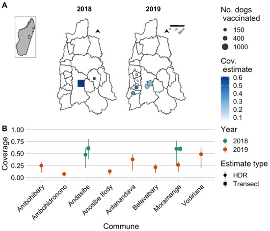Estimates of coverage achieved by the 2018 and 2019 campaigns. (A) The commune-level numbers of dogs vaccinated (size of points) and the associated coverage estimates (color of points) for the year 2018 (squares, estimated using post-vaccination transects) and 2019 (circles, estimated using a human-to-dog ratio (HDR) of 19.5, based on a recent household survey in the Moramanga District). The inset shows the location of the Moramanga District in Madagascar. (B) A comparison of coverage estimates by location and by method of estimation (shape of points correspond to post-vaccination transects vs. HDR-based estimates); for transect-based estimates, the line range shows the 95% exact binomial confidence interval, while for the HDR-based estimates, the line range shows the range of coverage estimates assuming an HDR range of 8–25 according to estimates from the literature.