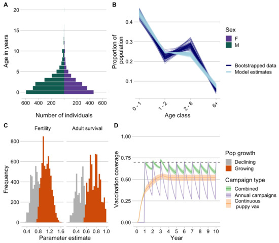 There were several limitations to our analyses. Owner reports of willingness to pay, age of animals, and distance travelled to the vaccination point likely all suffer from recall bias and uncertainty. Owner-based estimates of age are very coarse, but given the broad age classes we used, they likely are of sufficient precision to capture broad patterns in age structure. However, the ages of the animals brought to vaccination points may not be representative of the age structure of the underlying population. Previous work has shown that, in general, puppies (individuals <1 year) tend to have lower vaccination coverage than adults [30,31,32,33]. Additionally, we did not vaccinate animals less than 1 month of age, which may explain why we sometimes estimated declining populations (as part of the age class of 0–1 years was not captured by the data). Despite these issues, our analyses based on these data are consistent with previous findings from sub-Saharan Africa that demonstrate male-biased populations, skewed towards puppies, and with high mortality in the first year of life [22,34].