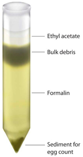 Faecal material (~500 mg) was added to 10 ml of clean water and mixed. Then, the specimen was vigorously shaken and filtered through a moulded strainer, identical to the one mentioned above. After the suspension was centrifuged (500 g for 5 min), the supernatant was discarded, and the sediment was re-suspended with 10 ml of a 10% formalin solution. Thereafter, 4 mL of ethyl-acetate was added, the solution was vigorously shaken for 30 s and then centrifuged at 500 g for 5 min in a conical centrifuge tube. The plug of debris that formed at the top of the tube was freed and the top layers of the supernatant containing ethyl-acetate, debris and formalin were decanted (Figure 1). Remaining debris were removed from the side of the tube with a cotton tipped applicator. Lastly, the concentrated sediment for the egg specimen was resuspended with 0.85% saline solution.