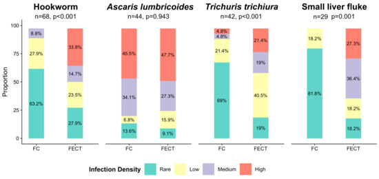 Infection intensities were compared for hookworm, A. lumbricoides, T. trichiura and small liver flukes if both methods agreed on positivity. In line with test sensitivities, higher egg densities were detected by FECT for hookworm (p < 0.001), T. trichiura (p < 0.001) and small liver flukes (p = 0.001), while no difference was seen for A. lumbricoides (p = 0.943) (Figure 2).