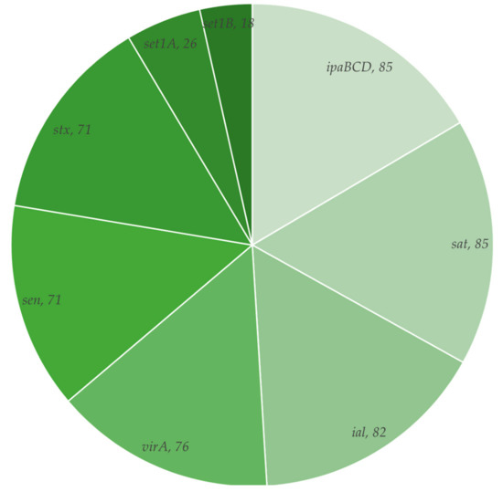 - Al-Maamory, E.H.; Al-Khafaji, J.K.; Al-Masoudi, H.K. Detection the virulence-associated genes in Shigella species isolated from diarrheal samples in Babylon Province. J. Pharm. Sci. Res. 2018, 10, 3201–3206. [Google Scholar]