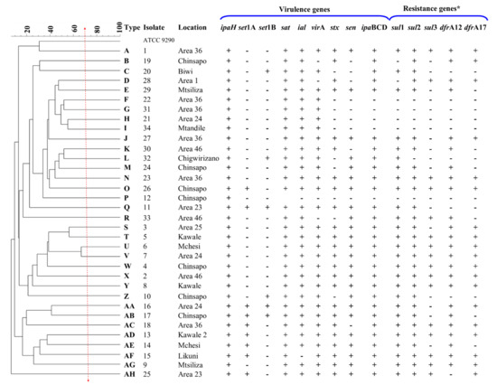 - Hosseini Nave, H.; Mansouri, S.; Emaneini, M.; Moradi, M. Distribution of genes encoding virulence factors and molecular analysis of Shigella spp. isolated from patients with diarrhea in Kerman, Iran. Microb. Pathog. 2016, 92, 68–71. [Google Scholar] [CrossRef] [PubMed]