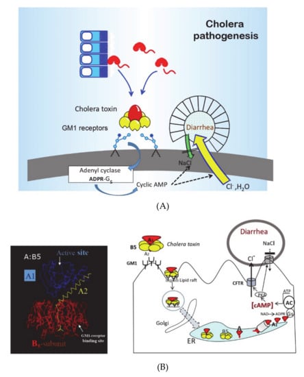 - Holmgren, J. Actions of cholera toxin and the prevention and treatment of cholera. Nature 1981, 292, 413–417. [Google Scholar] [CrossRef] [PubMed]