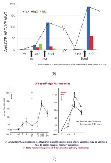 - Leach, S.; Lundgren, A.; Svennerholm, A.M. Different kinetics of circulating antibody-secreting cell responses after primary and booster oral immunizations: A tool for assessing immunological memory. Vaccine 2013, 31, 3035–3038. [Google Scholar] [CrossRef]