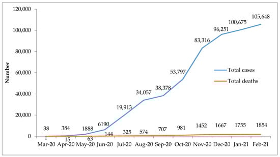 There was a gradual increase in COVID-19 cases and deaths during the 12 months, with 105,648 cases and 1,854 deaths reported to WHO by the end of February 2021 (Figure 1).
