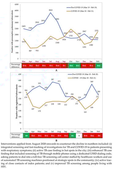 The monthly number of people presenting with presumptive PTB and those registered for TB in the pre-COVID-19 and COVID-19 periods are shown in Figure 2A,B. The footnotes in the figures indicate the interventions put in place from August 2020 onwards to counteract the downward trends. Compared with the pre-COVID-19 period, the decline in presumptive TB in the first six months of the COVID-19 pandemic (March to August 2020) was 53.2%, which was very different to the 5.2% increase observed in the second six months (September 2020 to February 2021). The decline in registered TB in the first six months of the COVID-19 pandemic was 34.7%, which was greater than the 19.9% decrease observed in the second six months.