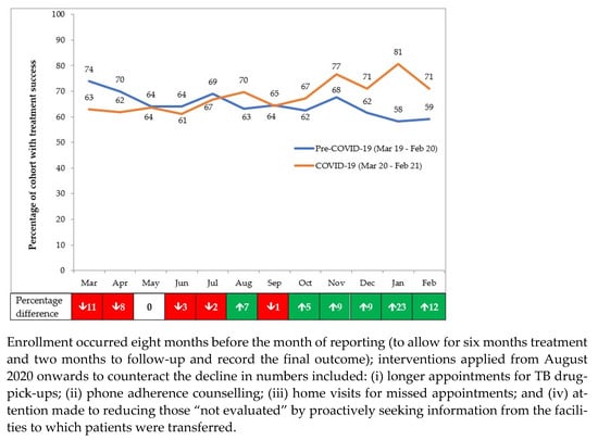 The monthly treatment success rates in the pre-COVID-19 and COVID-19 periods are shown in Figure 3. The footnotes indicate the interventions put in place from August 2020 onwards to counteract the downward trends. Compared with the pre-COVID-19 period, the decline in treatment success in the first six months of COVID-19 was 2.5%, which was very different to the 9.7% increase observed in the second six months.