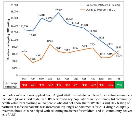 - Mhango, M.; Chitungo, I.; Dzinamarira, T. COVID-19 Lockdowns: Impact on Facility-Based HIV Testing and the Case for the Scaling Up of Home-Based Testing Services in Sub-Saharan Africa. AIDS Behav. 2020, 24, 3014–3016. [Google Scholar] [CrossRef] [PubMed]