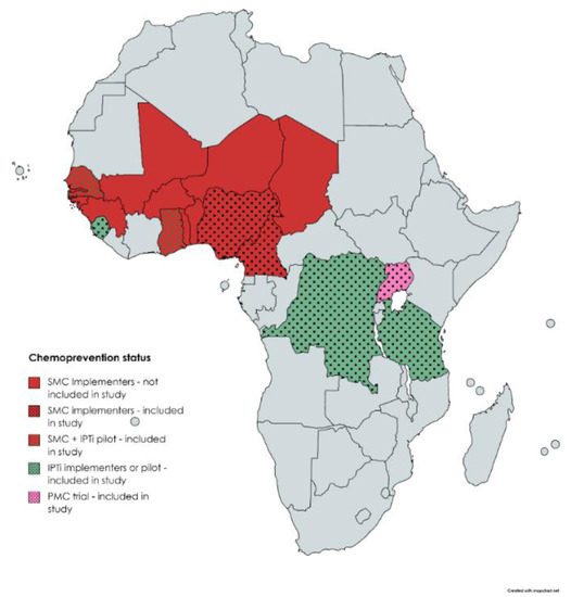 These countries were also selected because of their geographic diversity within Africa and their varying population size. Figure 1 provides a geographical view of the countries currently implementing or having piloted the various chemoprevention interventions. The dotted font is indicative of the countries that were included in this study. Participants from all countries were asked questions about their vaccination programs and how they manage severe anemia patients.