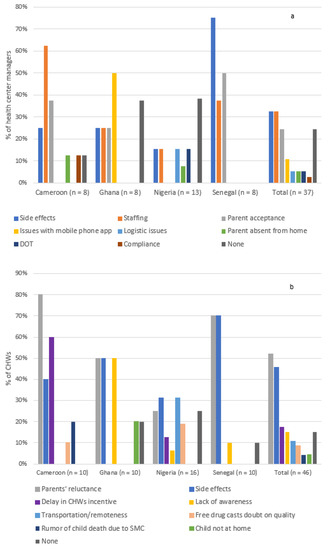 Barriers to SMC implementation at (a) the health center level and (b) the community health worker level.