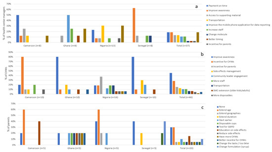 The three main ways to improve SMC delivery according to healthcare professionals who participated in the survey are: (1) better education of parents to increase their acceptance of SMC (Senegal); (2) on time payment of incentives (Cameroon), offering a better incentive plan to cover the transportation fee, or offering a small incentive to parents (Nigeria and Ghana); and (3) improvement of the side effects associated with the treatment (Senegal). For parents involved in the survey, the main suggested improvements were extension of SMC (to older children and even adults and to regions that are not currently covered) and extended duration (coverage for a longer period than the current four months) (Figure 4).