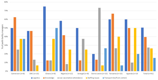 Perception, drivers, and barriers of the Expanded Programme on Immunization were investigated by interviewing 91 health center managers involved in the Expanded Programme on Immunization in all eight countries: Cameroon, the DRC, Ghana, Nigeria, Senegal, Sierra Leone, Tanzania, and Uganda. The Expanded Programme on Immunization was largely well-perceived by communities and parents, according to the health center managers who participated in the survey. The stated main hurdles fell into five broad categories: logistics-related issues, such as running out of stock or inadequate storage of product; lack of knowledge or understanding of the program by parents and lack of endorsement by community leaders; children not showing up; staffing issues, such as a lack of staff and high staff turnover; and transportation difficulties both for parents to come to the Expanded Programme on Immunization center and for staff to travel to communities (Figure 5).