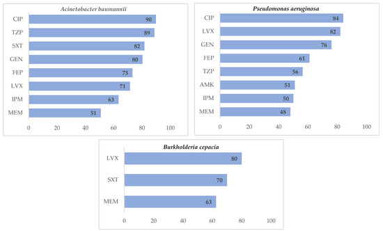Of all Acinetobacter baumannii isolates, 90% were resistant to ciprofloxacin, 89% to piperacillin/tazobactam and 82% to trimethoprim/sulfamethoxazole. Pseudomonas aeruginosa showed resistance to ciprofloxacin (84%), levofloxacin (82%) and gentamicin (76%). Burkholderia cepacia was commonly resistant to levofloxacin (80%), trimethoprim/sulfamethoxazole (70%), and Meropenem (63%) (Figure 3).