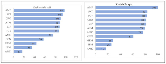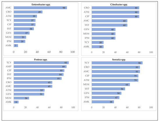 Escherichia coli were resistant most commonly to ampicillin (98%), trimehoprim/sulfamethoxazole (94%) and ceftriaxone (90%). Klebsiella spp. showed 100% resistance to ampicillin; they were also commonly resistant to trimethoprim/sulfamethoxazole (83%), ceftriaxone (82%) and aztreonam (81%). Among Enterobacter spp., 90% showed resistance to amoxicillin/clavulanic acid. Eighty percent of Citrobacter spp. isolates were resistant to ceftriaxone, aztreonam and ciprofloxacin. Resistance to tetracycline, ampicillin and ciprofloxacin was observed in 93%, 89% and 85% of Proteus spp. Isolates, respectively. Among Serratia spp., tetracycline (86%), ceftriaxone (81%) and amoxicillin/clavulanic acid (81%) were the most commonly resistant antibiotics (Figure 4).