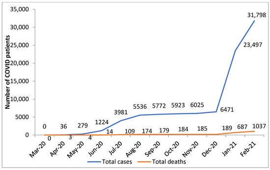 COVID-19 cases and deaths as reported to WHO gradually increased to 31,798 and 1037, respectively, during the 12-month period (see Figure 1).