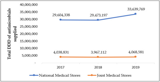 The total quantity of antimicrobials in DDDs supplied by both NMS and JMS to the 442 health facilities was 33,643,169, 33,440,308, 37,708,350 in 2017, 2018, and 2019, respectively. See Figure 1 for details. NMS supplied eight times as much antimicrobials as JMS.