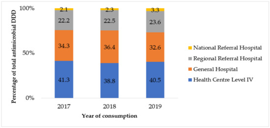Level IV health centers consumed the most antimicrobials by volumes supplied by NMS, while hospitals consumed the most antibiotics supplied by the private-not-for-profit warehouses. This could be explained by the fact that while Level IV health centers provide secondary care, they are numerous compared to the higher-level facilities and, therefore, their pooled consumption may appear high. The antimicrobial consumption shows, when analyzing DDD/100 admissions and DDD/100 patients, a decreasing trend from HC IV, hospital, regional referral, and a small amount at national referral level. This demonstrates more antimicrobial exposure in terms of numbers at the lower levels, which could explain that the lower levels treat more community-acquired infections. In contrast, regional and national referral hospitals cater to more complicated illnesses that span beyond just infectious diseases to complex conditions such as non-communicable illnesses including heart diseases, diabetes, kidney diseases among others.