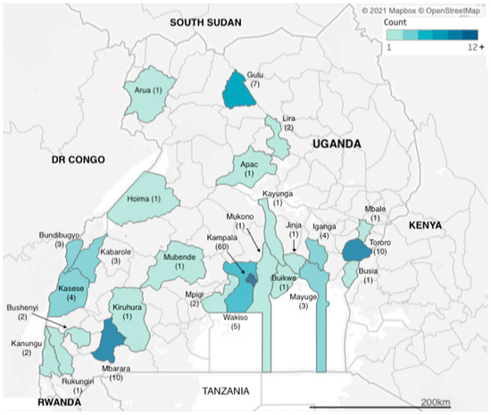We identified articles related to AMR from research carried out across two dozen districts in Uganda (Figure 2). However, more than a third of the studies (n = 60) were carried out in Kampala, which is also the capital city and where the national referral hospital, Mulago Hospital, is located. The next three most frequently observed study sites were Tororo, Mbarara and Gulu districts (n = 10, n = 10 and n = 7 studies), each of which has a regional referral hospital, for western, eastern and northern Uganda respectively. Additional districts with multiple identified studies included Kasese in western Uganda and Iganga in eastern Uganda (both n = 4 studies), both of which have large district hospitals that serve large communities; Bundibugyo and Kabarole districts (both n = 3 studies), which are situated in the western cattle corridor bordering the Democratic Republic of Congo. Studies carried out in Uganda totalled 155, while eight of the studies were multicountry studies, with Mayuge district (n = 3 studies) in eastern Uganda.