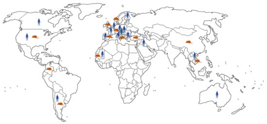 Geographic distribution of LCMV infections reported in humans and rodents.