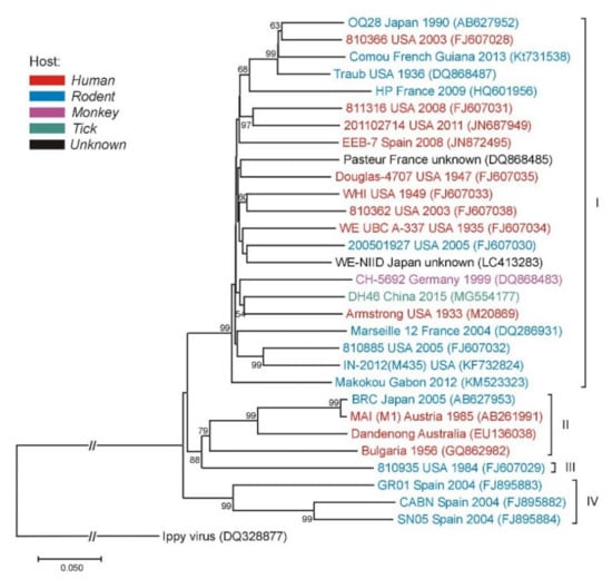 - Takagi, T.; Ohsawa, M.; Morita, C.; Sato, H.; Ohsawa, K. Genomic analysis and pathogenic characteristics of lymphocytic choriomeningitis virus strains isolated in Japan. Comp. Med. 2012, 62, 185–192. [Google Scholar]