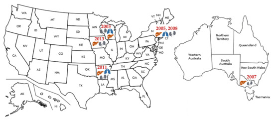 - Knust, B.; Ströher, U.; Edison, L.; Albariño, C.G.; Lovejoy, J.; Armeanu, E.; House, J.; Cory, D.; Horton, C.; Fowler, K.L.; et al. Lymphocytic choriomeningitis virus in employees and mice at multipremises feeder-rodent operation, United States, 2012. Emerg. Infect. Dis. 2014, 20, 240–247. [Google Scholar] [CrossRef]