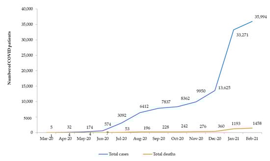 COVID-19 cases and deaths as reported to WHO cumulatively increased to 35,994 and 1458, respectively, during the 12 months (see Figure 1).