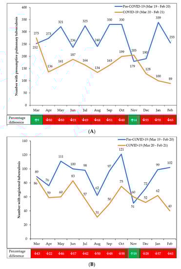 The monthly numbers of persons presenting with presumptive PTB and registered TB in the pre-COVID-19 and COVID-19 periods are shown in Figure 2A,B. The footnotes for the Figures indicate the interventions that were put in place to counteract the downward trends.