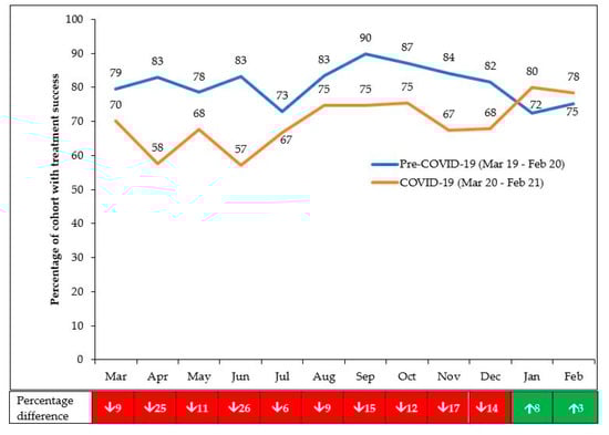 The monthly treatment success rates in the pre-COVID-19 and COVID-19 periods are shown in Figure 3. Interventions to reverse downward trends are indicated in the footnotes. Compared with the pre-COVID-19 period, the decline in treatment success was 14% in the first 6 months of COVID-19. This improved in the second 6 months when the decline was 7.8%. Treatment success particularly improved in January and February 2021 to 80 and 78%, respectively.