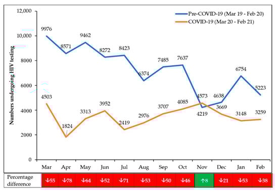 The monthly numbers tested for HIV in the pre-COVID-19 and COVID-19 periods are shown in Figure 4.