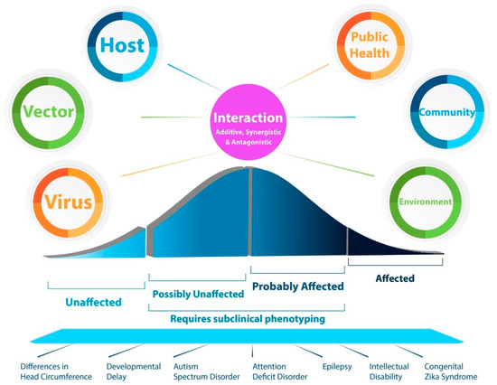 Causes of phenotypic variability after a prenatal viral infection are emerging but are as yet unclear (Figure 1). Furthermore, their relative contributions (and their interaction) to risk or protection in disease are unknown. Recent studies suggest that some of these factors can include differences in the virus, vector (mosquito), host (which includes the mother, placenta, and fetus), medical care (including early diagnosis and treatment), local community, and environment. Each of these factors might interact with in additive, synergistic, or antagonistic ways that affect the development of the central nervous system. Clinical and epidemiologic data shows a phenotypic spectrum of neurodevelopmental disabilities after prenatal viral infection. In fact, while some individuals are either unaffected or affected, the likely majority of individuals may be affected but require deep clinical (or subclinical) phenotyping over time to uncover the full impact based on recent studies [12,13]. Helpful phenotyping strategies can include neuroimaging, morphometrics, and long-term neurodevelopmental evaluations. These types of evaluations are often limited in low- and middle-income countries, which likely contributes to a systemic ascertainment bias for the number of affected individuals.