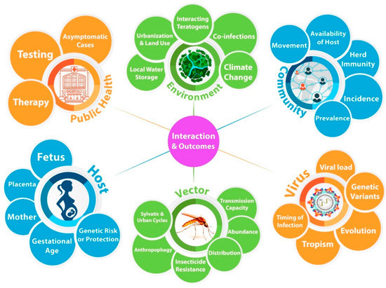 The following sections cover differences in the virus, mosquito vector, human host, and their context, including public health and medical infrastructure, local community, and broader environment that can affect disease outcome after prenatal viral infection (Figure 2). Because of the number of people who were infected and are affected and mobilization by national and international research centers and funders to study this global health problem [22,23], the 2015 Zika virus pandemic offers a unique opportunity to study causes of phenotypic variability after prenatal viral infection and other environmental teratogens that affect the developing human brain.