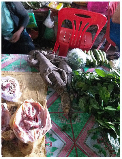 Infection of A. cantonensis is typically associated with the consumption of an undercooked or uncooked (raw) host species, predominantly molluscs, but also frogs, centipedes, crustaceans, fish and lizards [6,12,13,14,15]. Consumption of raw protein dishes is common in the Lao PDR and not only include fish [16] but also snails (in a dish called ‘koi hoi’) and lizard. Monitor lizards can routinely be observed being sold at wet markets in the Lao PDR (Figure 1), with estimates putting typical yearly trade at 4536 individual lizards per market [17,18]. Monitor lizards of the genus Varanus have been well documented as paratenic hosts for A. cantonensis. Yellow tree monitors (V. bengalensis) from across Thailand have been shown to be infected, with 95.5% of those sampled positive for A. cantonensis [19].