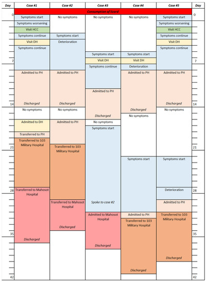 Seven males, aged between 22 to 36 years, caught a wild monitor lizard and consumed the raw meat together in a shared meal in Vientiane Province, Lao PDR, on 21 May 2020. All seven individuals developed symptoms within one week. Case history for cases 1 to 5 is provided in Figure 2. Over a course of one month, cases 1 to 5 presented at either a local Healthcare Clinic and/or District Hospital. Cases 1 to 5 were later admitted to or transferred to the Provincial Hospital, 103 Military Hospital (Vientiane capital) and Mahosot Hospital (Vientiane capital). Initial treatments consisted of antibiotics and antipyretics, while no steroids were given. All five cases were successfully treated at Mahosot and 103 Military Hospitals following treatment with dexamethasone/prednisolone and albendazole and were discharged on days 34 to 41. Cases 6 and 7 did not attend any medical facilities and followed home treatments. Of the seven individuals, two were local farmers, while five were serving members of the Lao military. Individual case details are given below and in Table 1.