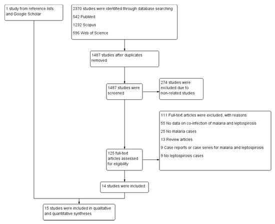 Overall, 2370 articles were retrieved from three databases: 542 from PubMed, 1232 from Scopus, and 596 from the Web of Science. After duplicates were removed, 1487 studies were screened for titles and abstracts. After 247 non-relevant articles were excluded, 125 articles were examined for full texts. Of the 125 articles examined for full text, 111 articles were excluded for the following reasons: 55 had no data on co-infection of malaria and leptospirosis, 25 had no malaria cases, 13 were review articles, 9 were case reports or case series for malaria and leptospirosis, and 9 had no leptospirosis cases. Fourteen articles [26,29,30,31,32,33,34,35,36,37,38,39,40,41] met the eligibility criteria and were included in the qualitative synthesis. Additional searches on reference lists and Google Scholar found one article [42]. Finally, 15 articles [26,29,30,31,32,33,34,35,36,37,38,39,40,41,42] were included in the qualitative and quantitative syntheses (Figure 1).